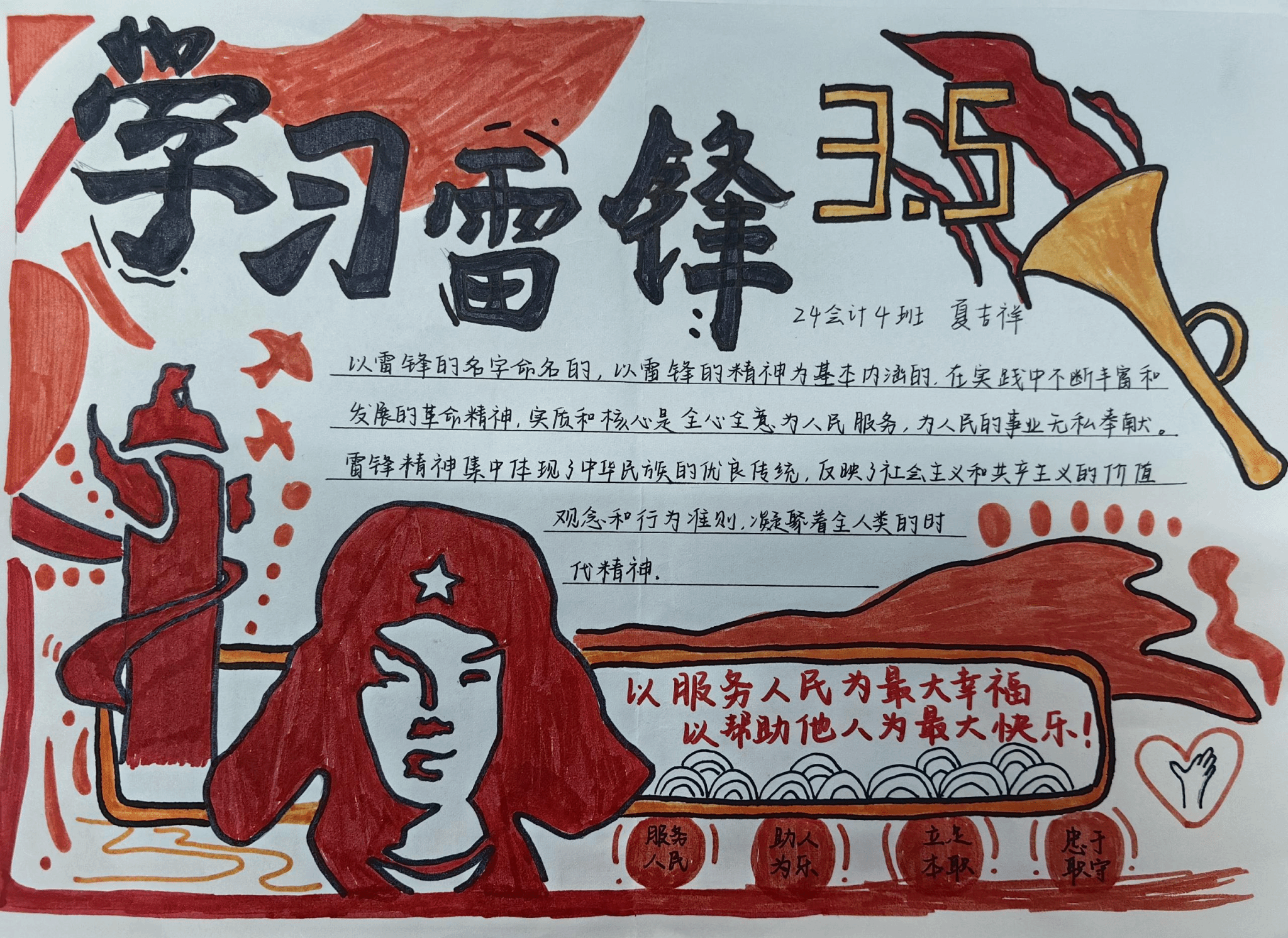 手绘雷锋风采,传承榜样精神。面向全体学生发起“弘扬雷锋精神,传递榜样力量”主题手抄报创作活动。同学们以画笔为媒,通过生动的图画和真挚的文字,展现雷锋同志的光辉形象和感人事迹,诠释对雷锋精神的理解。活动优秀作品在社区宣传栏集中展示,营造了“人人学雷锋、处处见行动”的浓厚氛围。