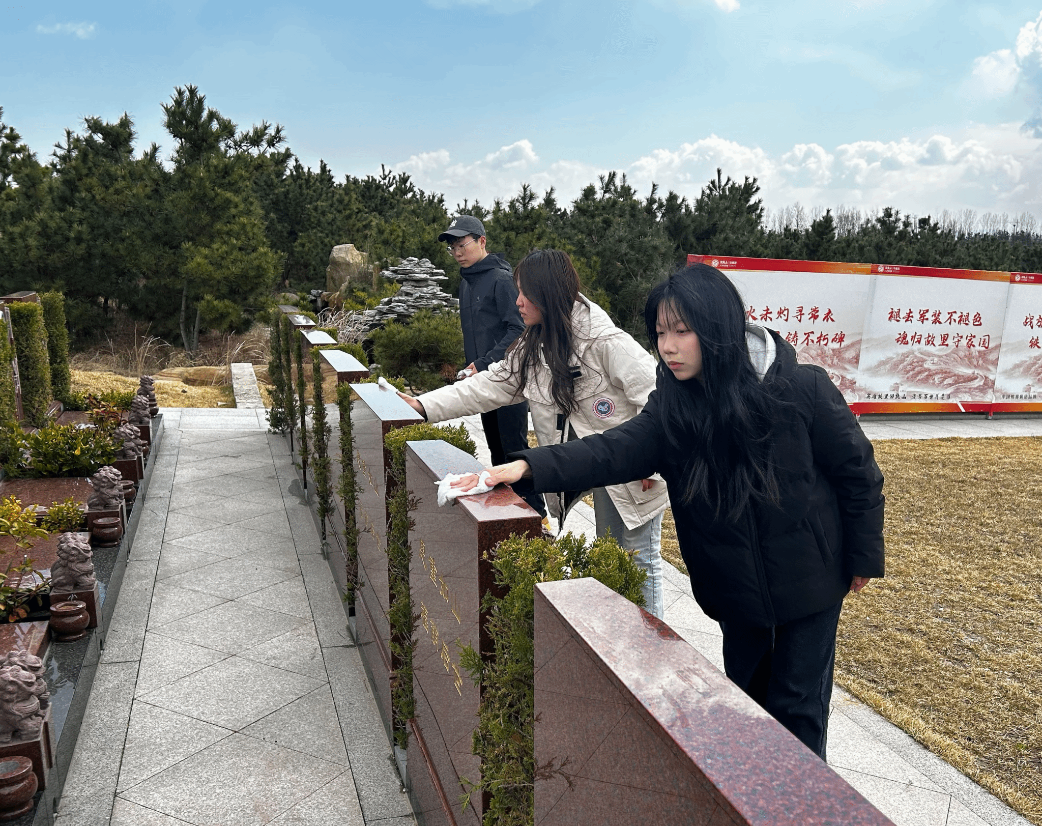 当天上午,志愿者们怀着崇敬的心情来到回龙山功德园。在烈士墓前,整齐列队,庄严肃立,表达对先烈们的深切哀悼和无限敬意。随后,志愿者们依次向烈士墓敬献鲜花,鞠躬致敬,寄托对革命先烈的哀思与缅怀之情。祭扫过程中,志愿者们认真地擦拭着墓碑上的灰尘和污渍,动作轻柔而庄重。每一块墓碑都被擦得干干净净,表达了对先烈们最深切的问候和最崇高的敬意。