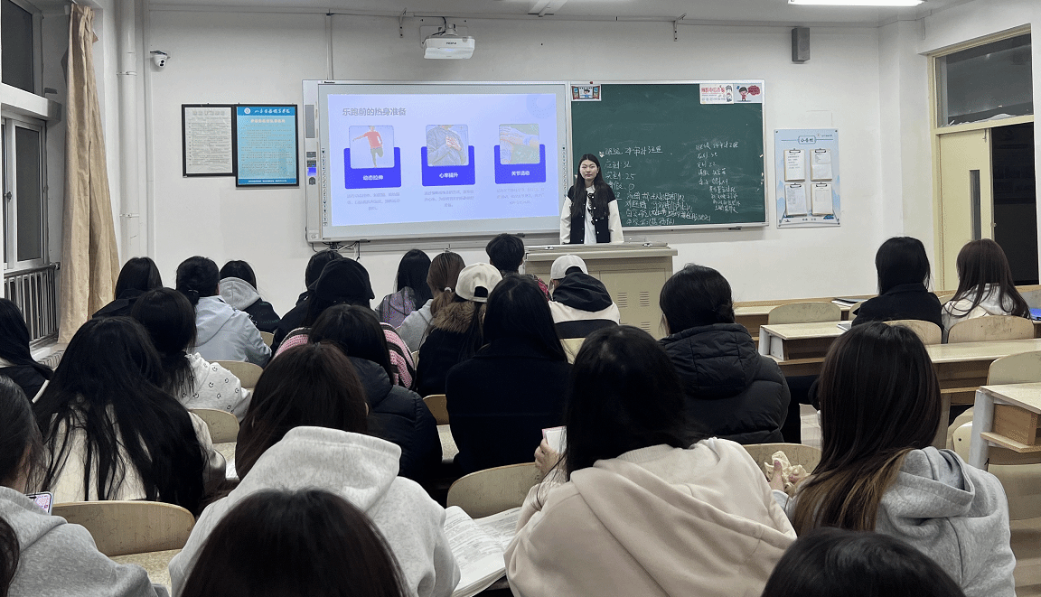 科学乐跑,赋能青春成长。“跑步是身体律动,更是心灵修行。”宣讲结合数据案例,深入解析规律跑步对提升心肺功能、增强免疫力、缓解学业压力的多重益处,强调科学锻炼的重要性。活动中播放了健身达人分享专业跑步技巧的视频,从呼吸节奏到步伐控制,帮助同学们规避运动损伤风险,培养可持续的健康习惯,让跑步成为青春活力的助推器。