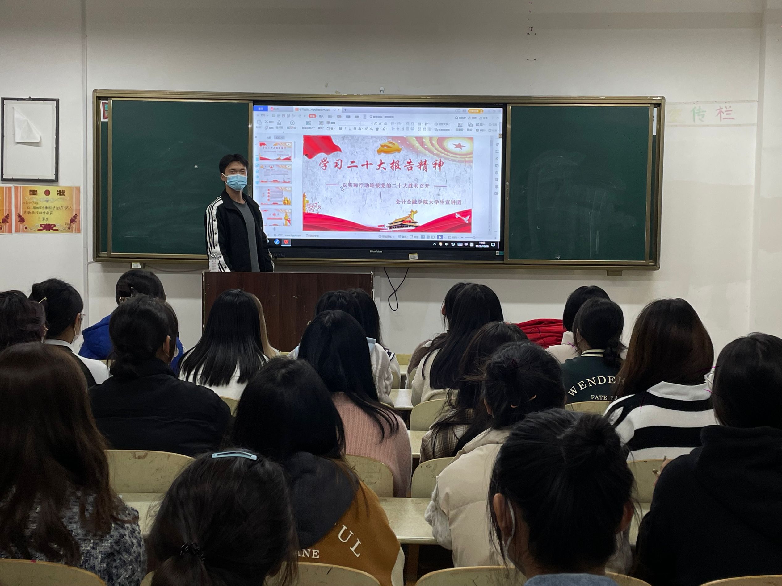 为深入学习党的二十大精神,推动青年大学生努力成长为有理想、敢担当、能吃苦、肯奋斗的新时代青年,近日,会计金融学院大学生宣讲团走进教室,与同学们共同学习二十大讲话精神,交流心得体会。