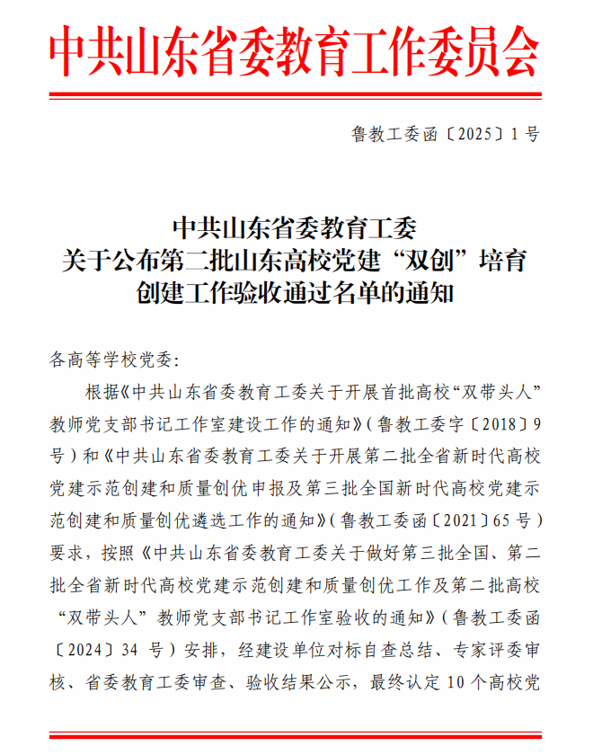 本站讯 近日,山东省委教育工委公布了第二批全省高校党建“双创”(党建工作示范高校、标杆院系、样板支部)培育创建单位验收结果,我校会计金融学院党总支以优异成绩通过验收,标志着学院党建工作再上新台阶