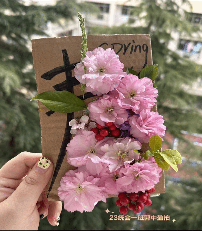 在“纸骨生花”活动中,环保理念进一步延伸至纸艺创作。学生们以废弃纸板为“大地之骨”,结合校园内自然掉落的落叶、枯枝、花瓣等,通过绘画与拼贴赋予其新生。一件件作品将粗粝纸板与柔美自然元素交融,既展现艺术美感,又传递“零废弃”理念。24金融1班王华婧同学表示:“当废弃材料在自己手中变成艺术品,环保与艺术的结合如此美妙,更坚定了践行绿色生活的决心。”