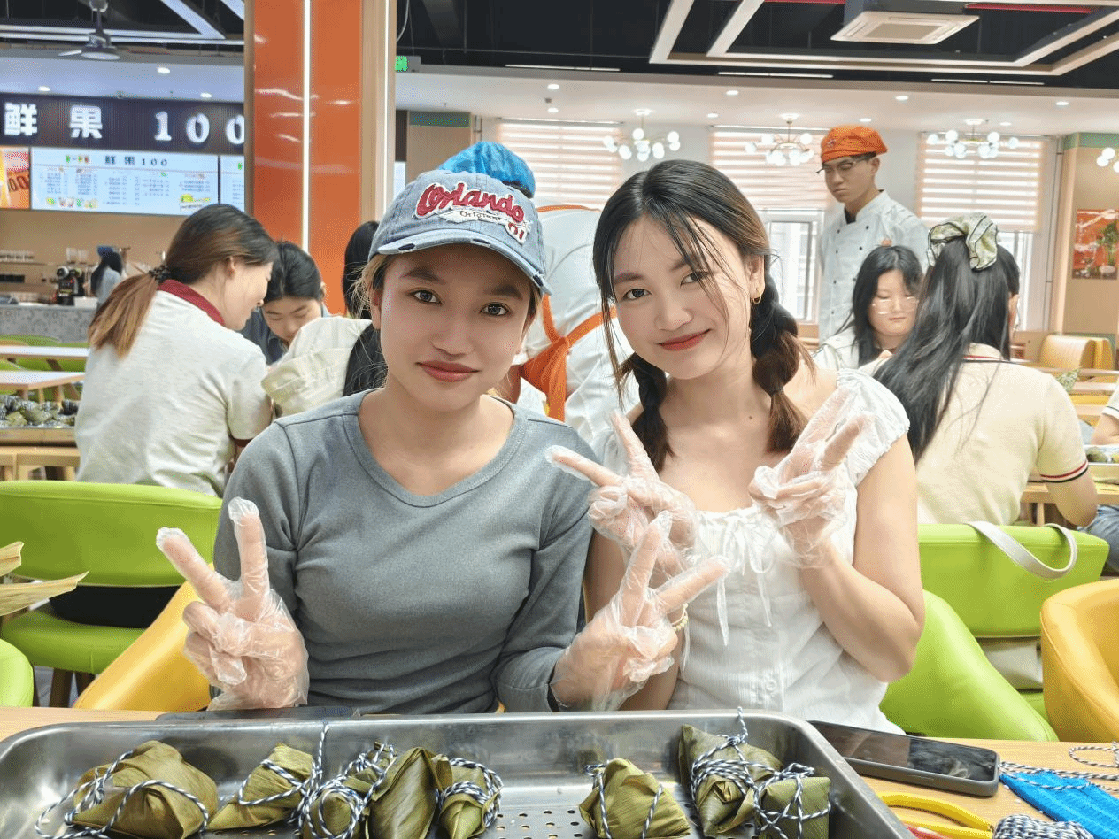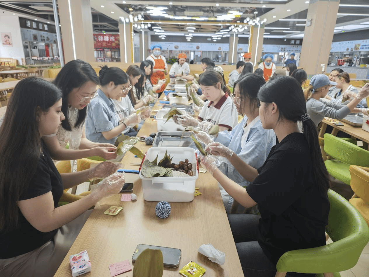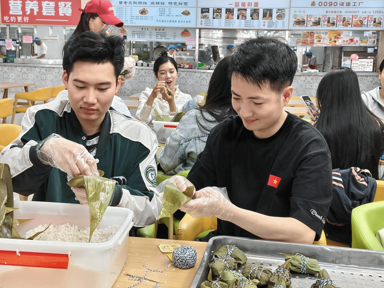 在食堂师傅的悉心指导下,中外学子携手体验包粽子的传统技艺。留学生们不仅认真学习折叶、填米、捆绳等步骤,更别出心裁地将写有母语祝福的纸条包入粽中,为传统习俗增添国际色彩。会计金融学院的同学们则化身“文化使者”,耐心细致地帮助留学生完成每个环节。在粽叶飘香中,中外学子互帮互助,既传承了中华传统技艺,又促进了跨文化理解,现场洋溢着温馨和谐的氛围。