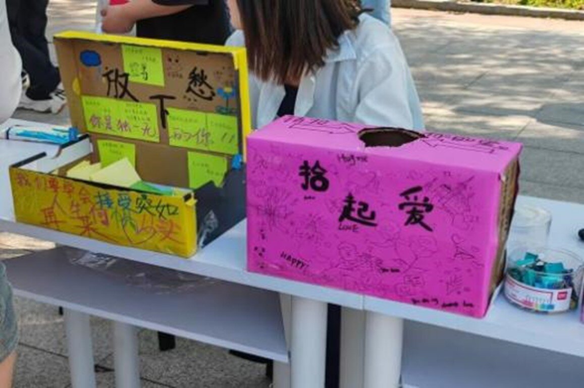 举办“拾起爱,放下愁”心情盲盒活动。参与活动的同学将自己写好的标签放在黄色盒子当中,并在红色盒子中拿到陌生人的激励等话语,通过向他人表达爱与鼓励,促进了同学们的积极情绪表达。