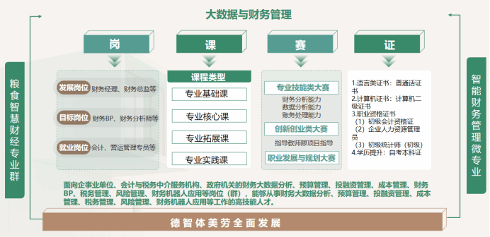本专业培养能够践行社会主义核心价值观,传承技能文明,德智体美劳全面发展,具有一定的科学文化水平,良好的人文素养、科学素养、数字素养、职业道德、创新意识,爱岗敬业的职业精神和精益求精的工匠精神,较强的就业创业能力和可持续发展的能力,掌握本专业知识和技术技能,具备职业综合素质和行动能力,面向企事业单位、会计与税务中介服务机构、政府机关的财务大数据分析、预算管理、投融资管理、成本管理、财务BP、税务管理、风险管理、财务机器人应用等岗位(群),能够从事财务大数据分析、预算管理、投融资管理、成本管理、税务管理、风险管理、财务机器人应用等工作的高技能人才。